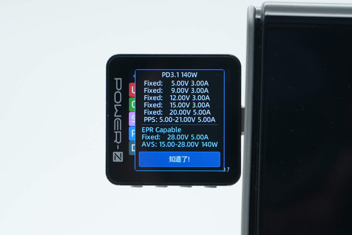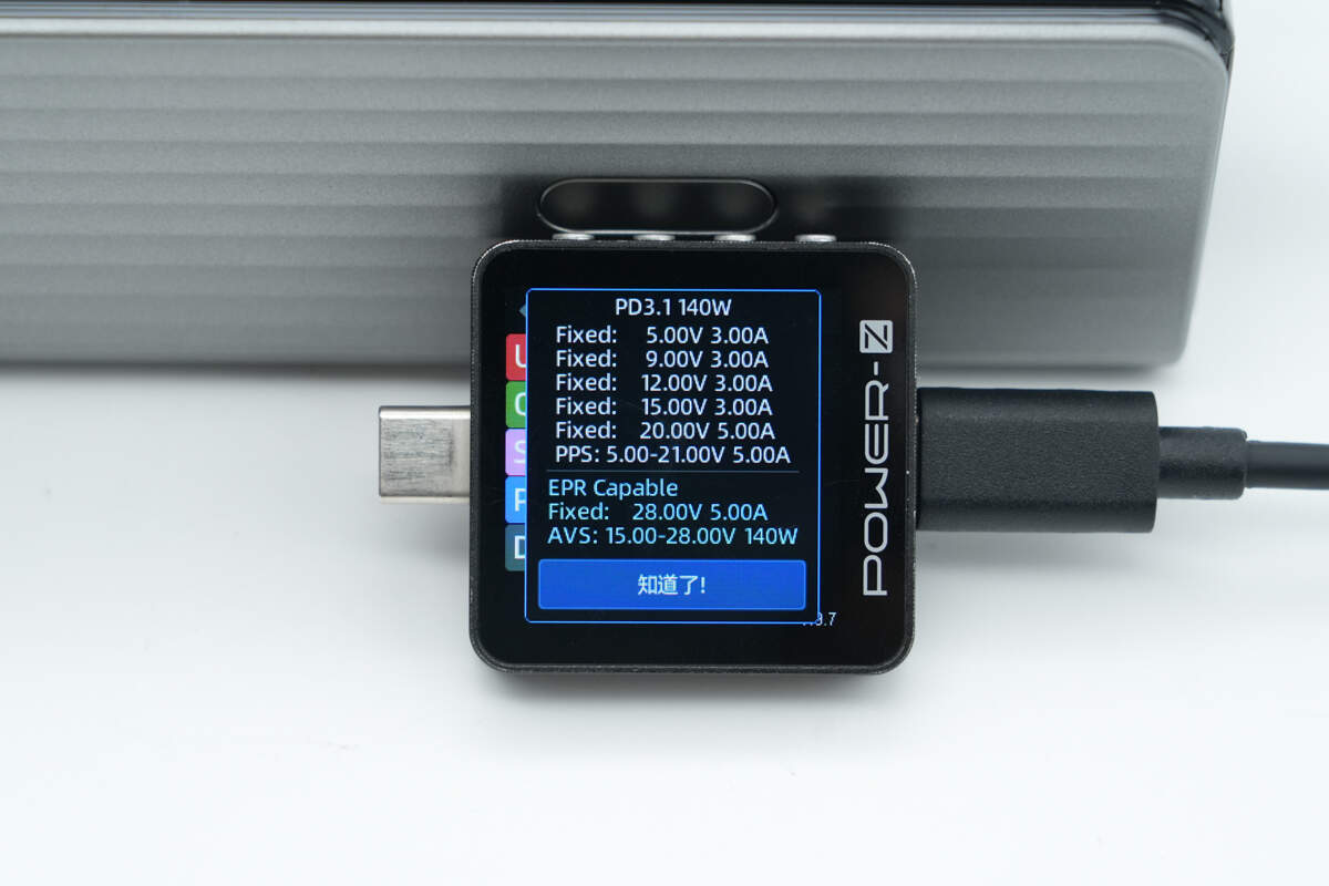 PDO报文显示USB-C1口还具备5V3A、9V3A、12V3A、15V3A、20V5A、28V5A六组固定电压档位,以及5-21V5A一组PPS电压档位和15-28V 140W AVS电压档位。