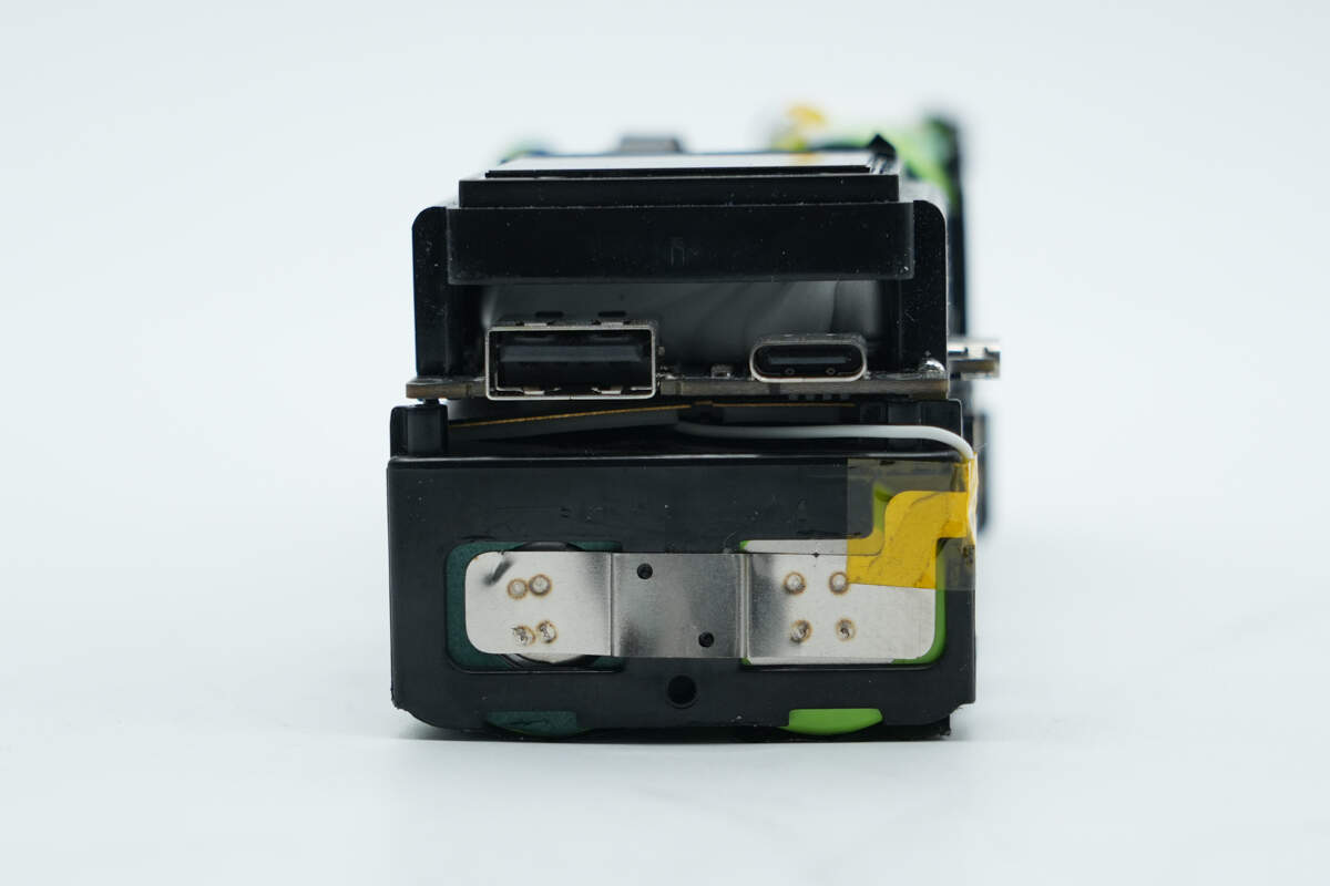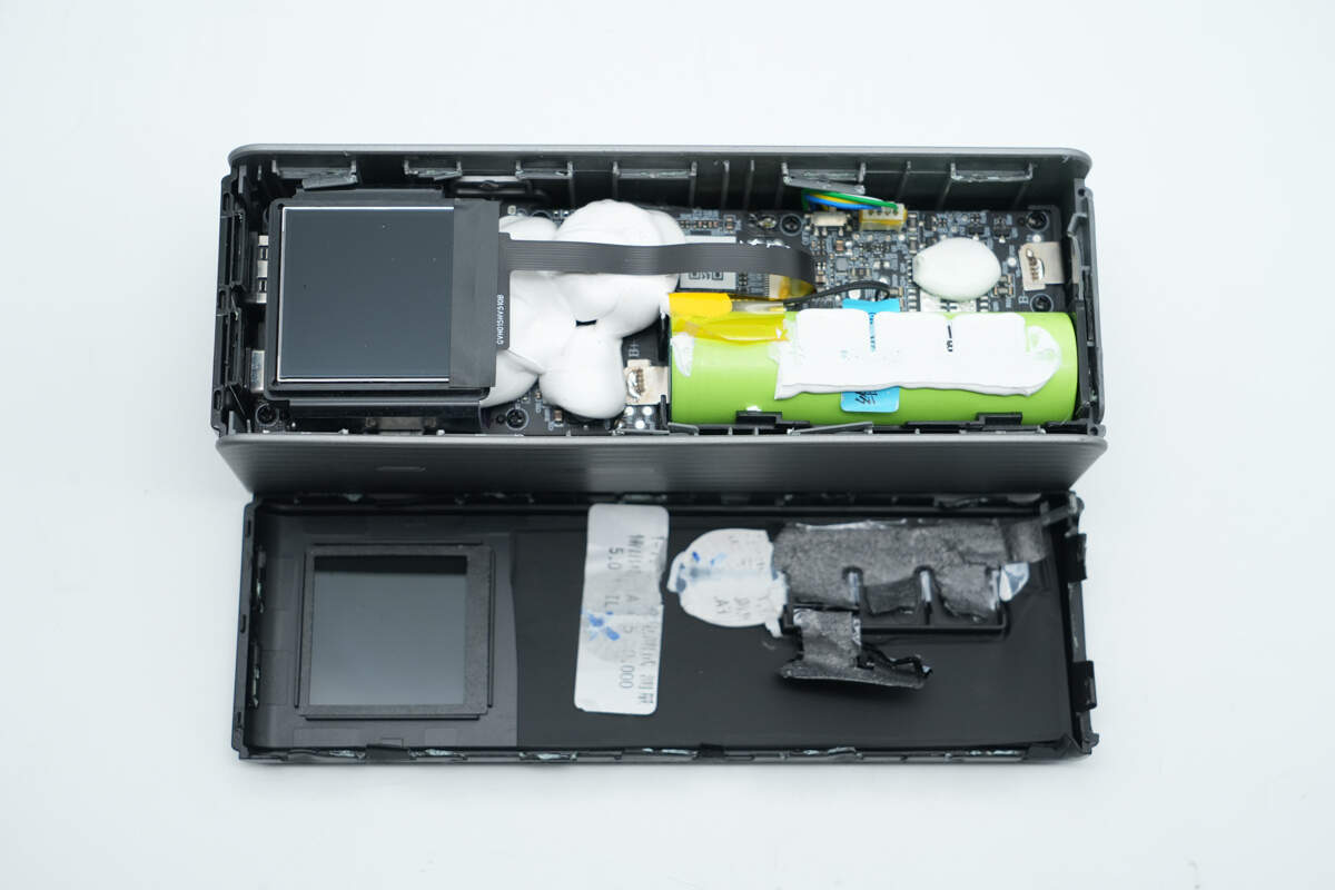 此外采用南芯科技SC1815A升降压控制器搭配芯海科技CPW3221协议芯片方案实现2C1A接口快充控制。芯海科技MCU搭配复旦微存储器为丰富屏显功能提供支持,德州仪器降压方案进行供电。壳体上贴有石墨散热贴纸,器件、电芯打胶加固,做工可靠。