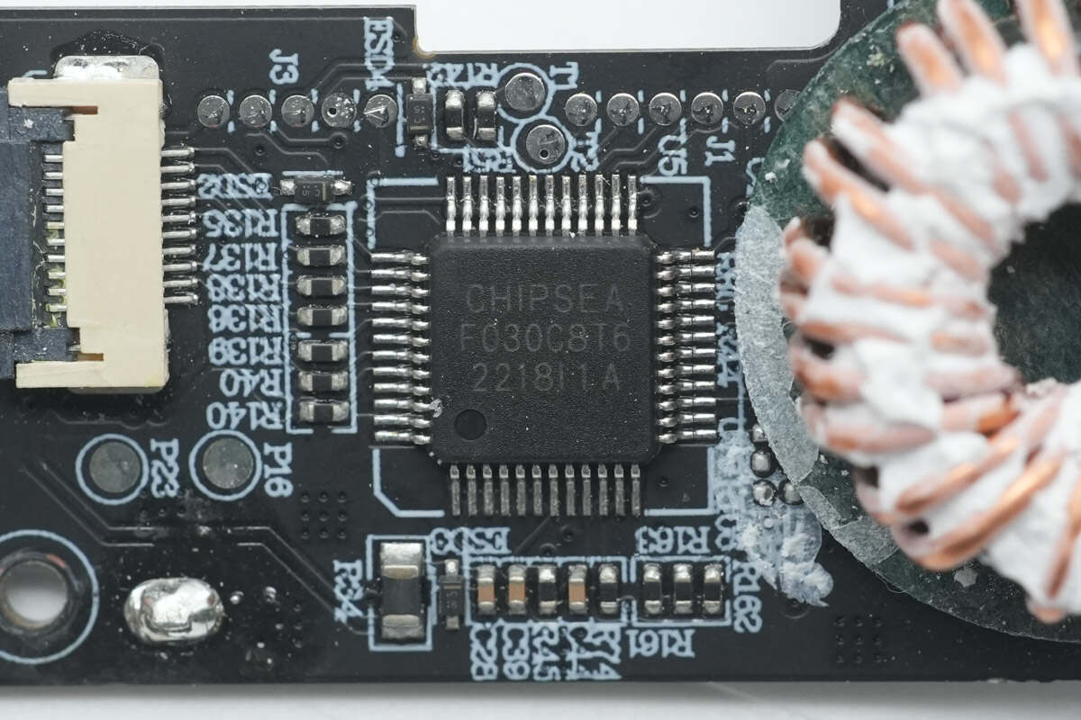用于整机控制的MCU来自芯海科技,型号CS32F030C8T6,芯片内置48MHz主频 ARM Cortex-M0 CPU,集成64KB FLASH和8KB SRAM,具备两个UART接口,两个SPI接口和两个I2C接口,采用LQFP48封装。