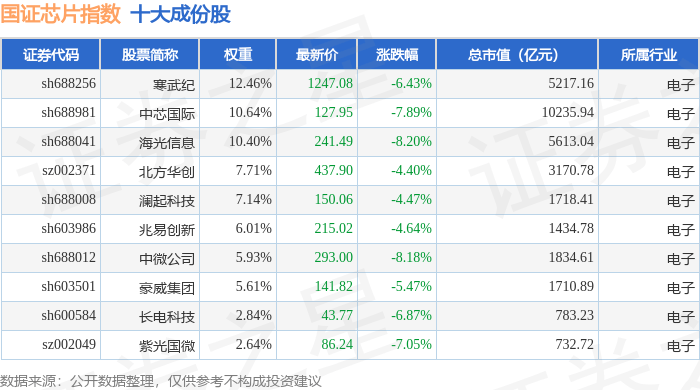 证券之星消息,10月10日,国证芯片(980017)指数报收于13412.82点,跌5.94%,成交1460.59亿元,换手率4.36%。当日该指数成份股中,上涨的有2家,通富微电以3.19%的涨幅领涨,下跌的有26家,晶合集成以11.03%的跌幅领跌。