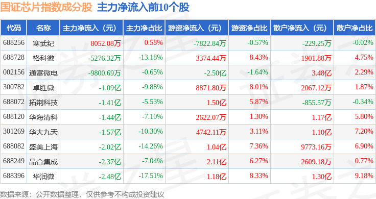 资金流向方面,国证芯片(980017)指数成份股当日主力资金净流出合计129.31亿元,游资资金净流入合计67.08亿元,散户资金净流入合计62.24亿元。成份股资金流向详情见下表:
