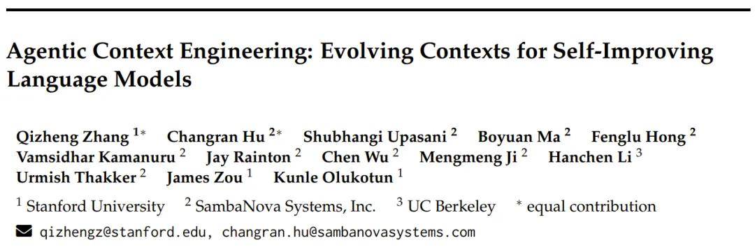 一篇来自斯坦福大学、SambaNova、UC 伯克利的论文近日引发了广泛讨论。他们提出了一种名为 Agentic Context Engineering(智能体 / 主动式上下文工程)的技术,让语言模型无需微调也能实现自我提升!