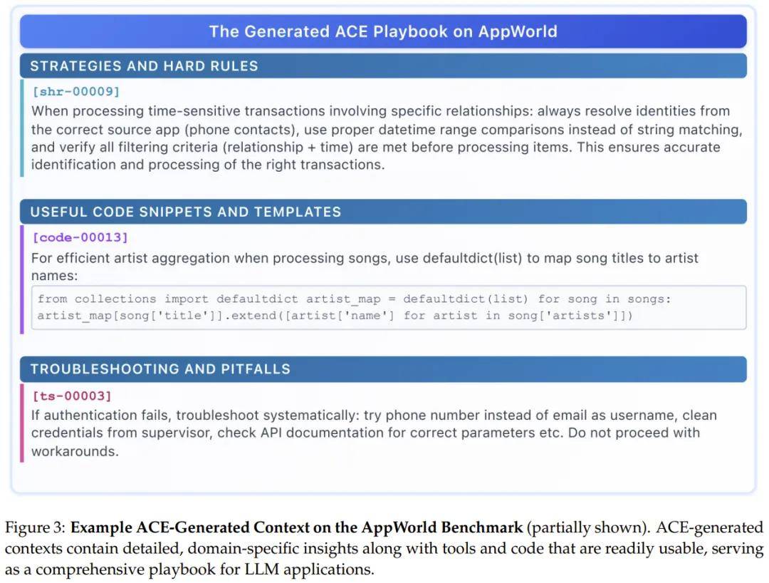 下图展示了在 AppWorld 基准上,ACE 生成的上下文示例(部分)。可以看到,ACE 生成的上下文包含了详细的、领域特定的洞见,以及可直接使用的工具与代码,构成了一个面向大型语言模型应用的完整「作战手册」。