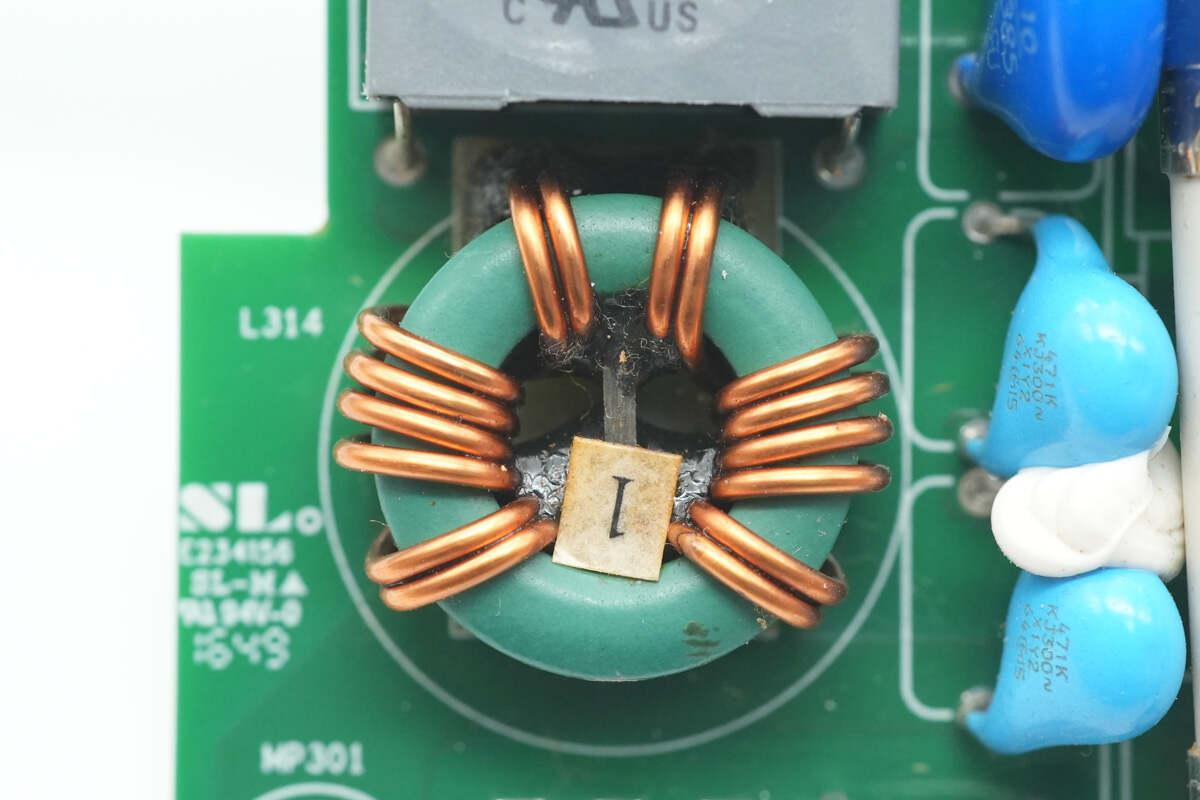 PFC升压电感采用漆包线绕制,底部设有电木板绝缘。