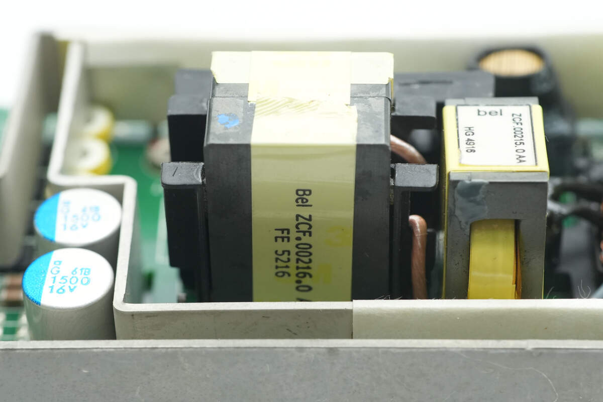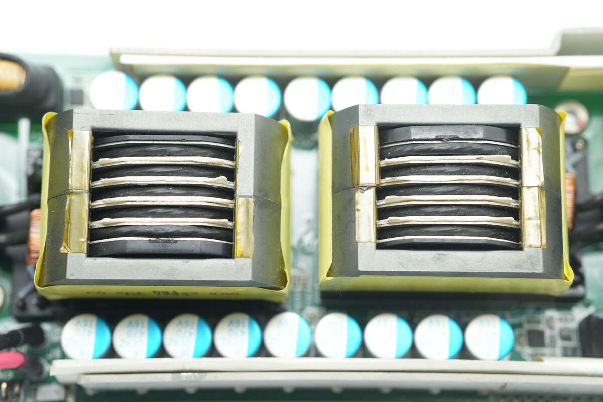 右侧设有两个变压器,变压器上下两侧设有滤波电容和连接铜条,变压器左侧和右侧设有散热片为开关管散热,中间位置散热片下方为待机电源电路。