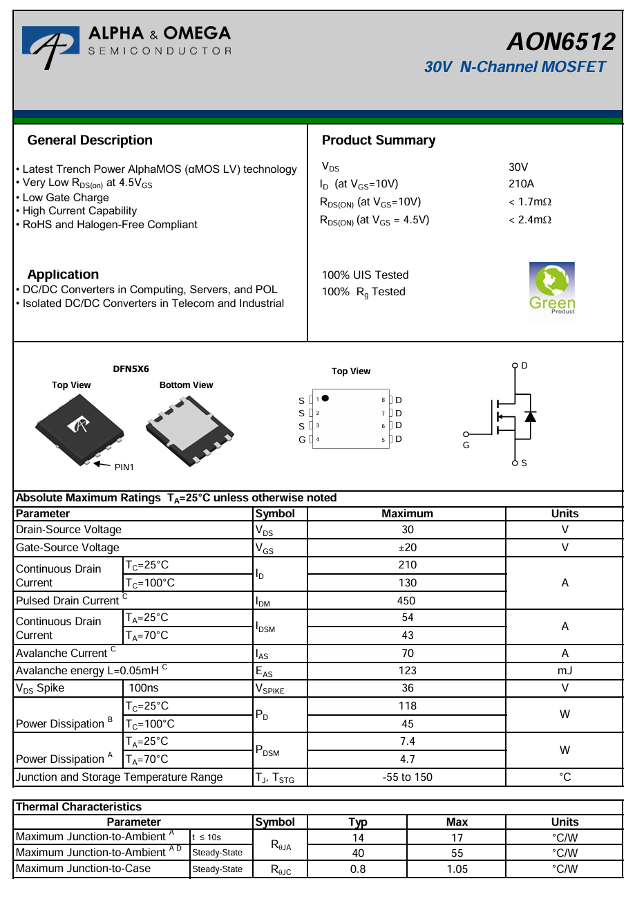 供电切换开关管来自万国半导体,型号AON6512,NMOS,耐压30V,导阻1.7mΩ,具备低栅极电荷和高电流能力,适用于DC/DC转换器应用,采用DFN5*6封装。