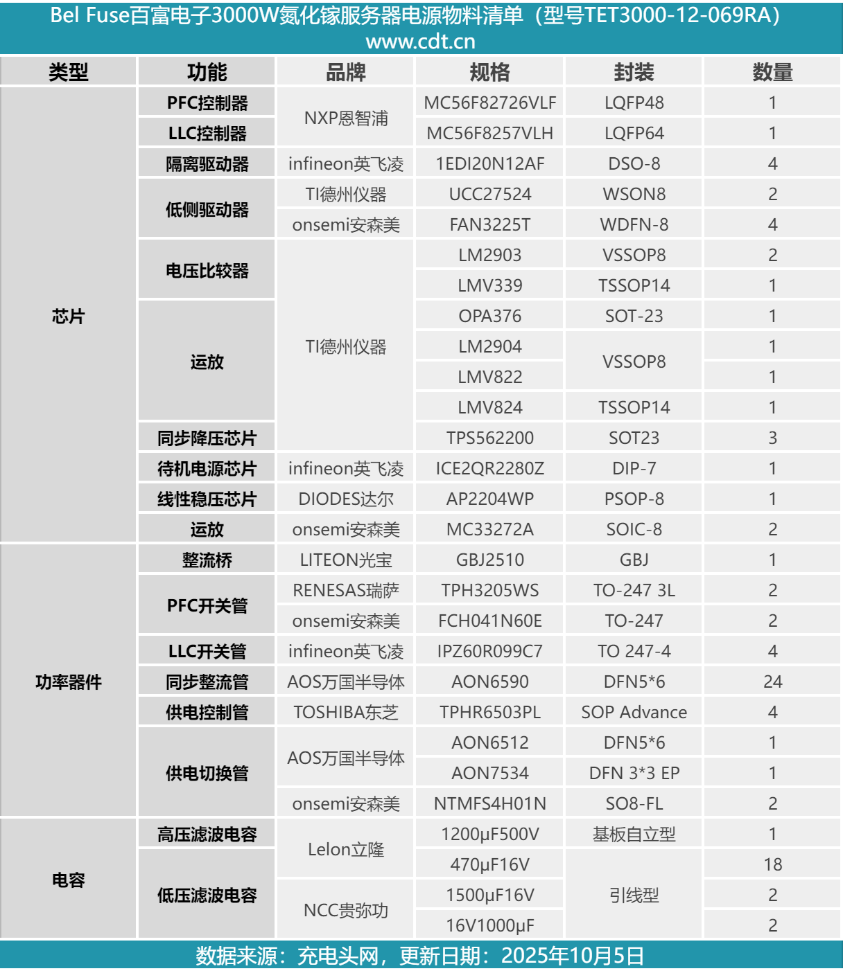 最后附上百富电子3000W氮化镓服务器电源的核心器件清单,方便大家查阅。