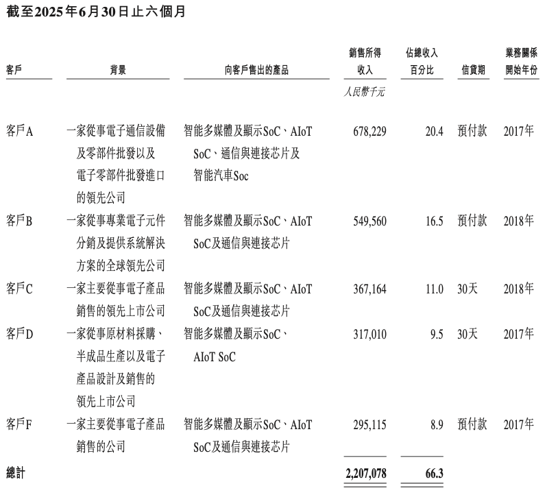 2022年、2023年、2024年、2025年1-6月,其五大客户合计产生的收入分别占总收入的57.9%、65.5%、63.3%、66.3%。