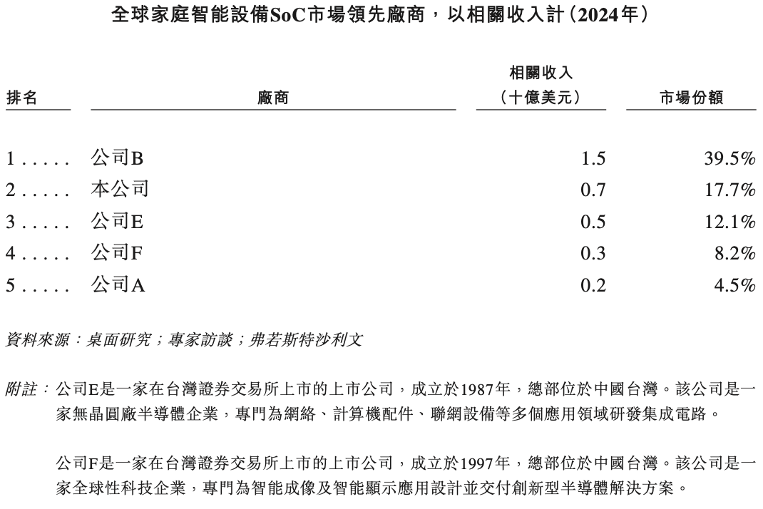 按2024年相关收入,晶晨股份在专注于智能终端SoC芯片的厂商中位列全球第四,在全球所有专注于提供SoC的智能设备SoC提供商中排名第三,在家庭智能终端SoC芯片领域位列中国大陆第一全球第二