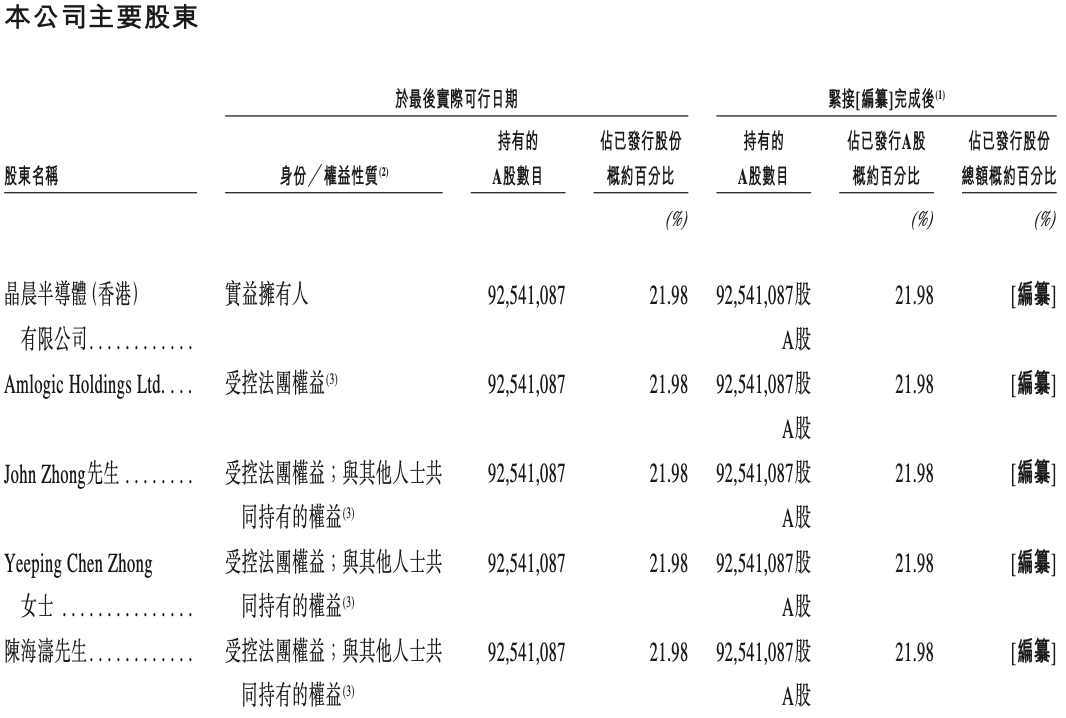 Raymond Wing-Man Wong(Amlogic Shenzhen的监事)持有Amlogic Holdings Ltd. 1.28%的股权。