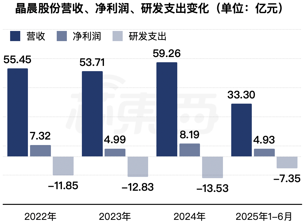 2022年、2023年、2024年、2025年1-6月,晶晨股份的营收分别为55.45亿元、53.71亿元、59.26亿元、33.30亿元,净利润分别为7.32亿元、4.99亿元、8.19亿元、4.93亿元,研发费用分别为11.85亿元、12.83亿元、13.53亿元、7.35亿元。