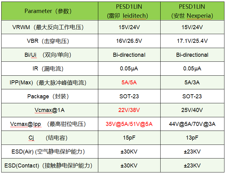 通过对比了知雷卯PESD1LIN参数性能优于Nexperia的 PESD1LIN 。