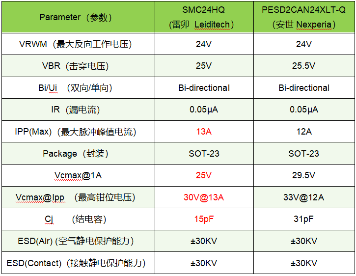 l 雷卯SMC24HQ替代Nexperia的PESD2CAN24XLT-Q参数对比: