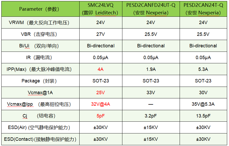 l 雷卯SMC24LVQ替代Nexperia的PESD2CANFD24UT-Q,PESD2CAN24T-Q,PESD2CANFD24LT-Q 参数对比