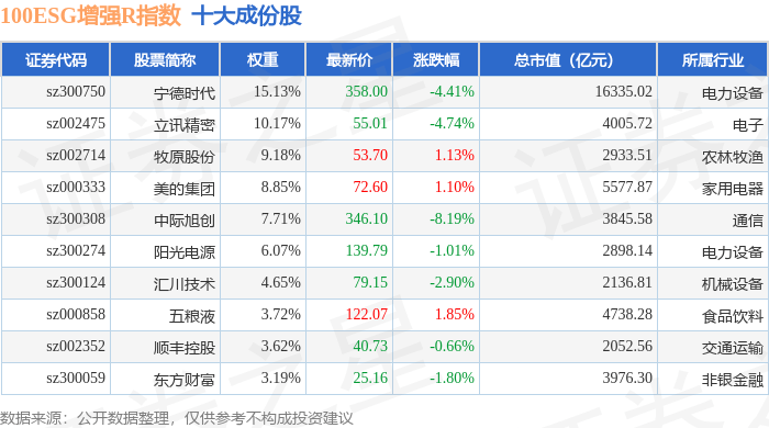 资金流向方面,100ESG增强R(470033)指数成份股当日主力资金净流出合计92.88亿元,游资资金净流入合计14.12亿元,散户资金净流入合计78.76亿元。成份股资金流向详情见下表:
