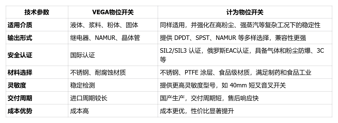 通过对比可以看出,计为物位开关不仅在功能上与 VEGA物位开关 相当,更在交付速度、成本控制以及本地化服务上具备明显优势。