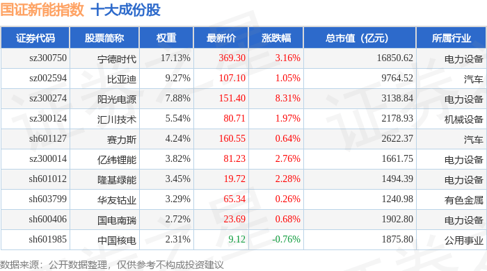 国证新能(399412)指数十大成份股详情如下: