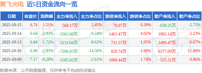 证券之星消息,截至2025年10月15日收盘,聚飞光电(300303)报收于6.74元,上涨1.51%,换手率2.63%,成交量34.93万手,成交额2.32亿元。