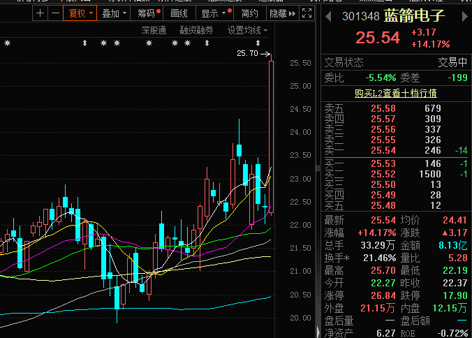 10月16日,蓝箭电子(301348)股价实现大涨,截至稿,股价涨超14%。