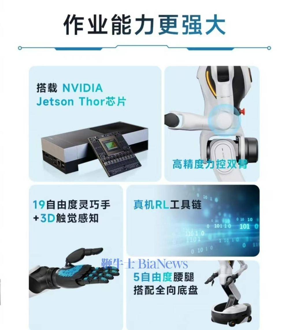 精灵G2搭载英伟达Jetson Thor T5000芯片,本地算力可达2070 TFLOPS(FP4),能实现低于10ms的实时决策响应。
