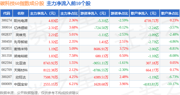 资金流向方面,碳科技60(399060)指数成份股当日主力资金净流出合计44.86亿元,游资资金净流入合计14.65亿元,散户资金净流入合计30.21亿元。成份股资金流向详情见下表: