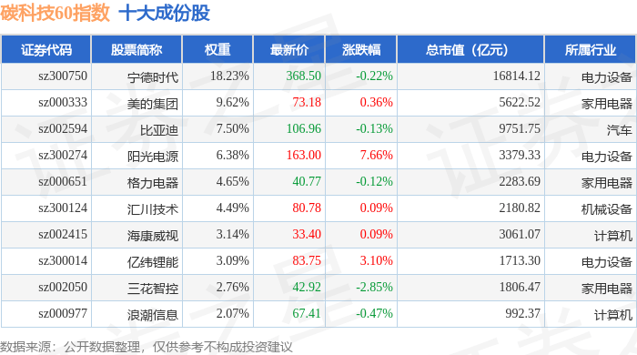 证券之星消息,10月16日,碳科技60(399060)指数报收于3367.28点,涨0.34%,成交1387.81亿元,换手率2.02%。当日该指数成份股中,上涨的有19家,阳光电源以7.66%的涨幅领涨,下跌的有39家,金力永磁以5.24%的跌幅领跌。