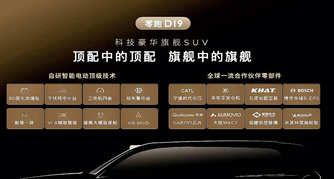 2025年10月16日晚间,零跑D19正式发布,新车定位于大型旗舰SUV,采用三排座位布局,首发搭载高通骁龙双8797至尊芯片,同时采用增程800V、纯电1000V的高压平台,预计在2026年正式上市。