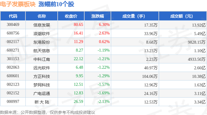 证券之星消息,10月16日电子发票板块较上一交易日下跌1.16%,华峰超纤领跌。当日上证指数报收于3916.23,上涨0.1%。深证成指报收于13086.41,下跌0.25%。电子发票板块个股涨跌见下表: