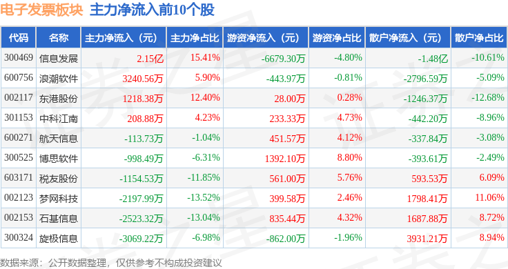 从资金流向上来看,当日电子发票板块主力资金净流出2.18亿元,游资资金净流入8220.86万元,散户资金净流入1.35亿元。电子发票板块个股资金流向见下表: