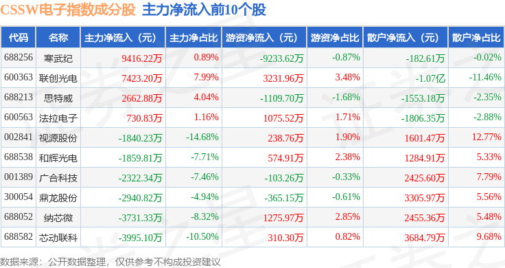 资金流向方面,CSSW电子(399811)指数成份股当日主力资金净流出合计156.54亿元,游资资金净流入合计46.12亿元,散户资金净流入合计110.42亿元。成份股资金流向详情见下表: