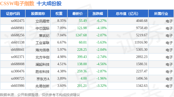 证券之星消息,10月17日,CSSW电子(399811)指数报收于5439.83点,跌4.3%,成交1499.5亿元,换手率2.35%。当日该指数成份股中,下跌的有60家,生益科技以10.0%的跌幅领跌。