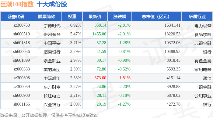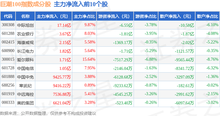 资金流向方面,巨潮100(399313)指数成份股当日主力资金净流出合计231.51亿元,游资资金净流入合计75.41亿元,散户资金净流入合计156.09亿元。成份股资金流向详情见下表: