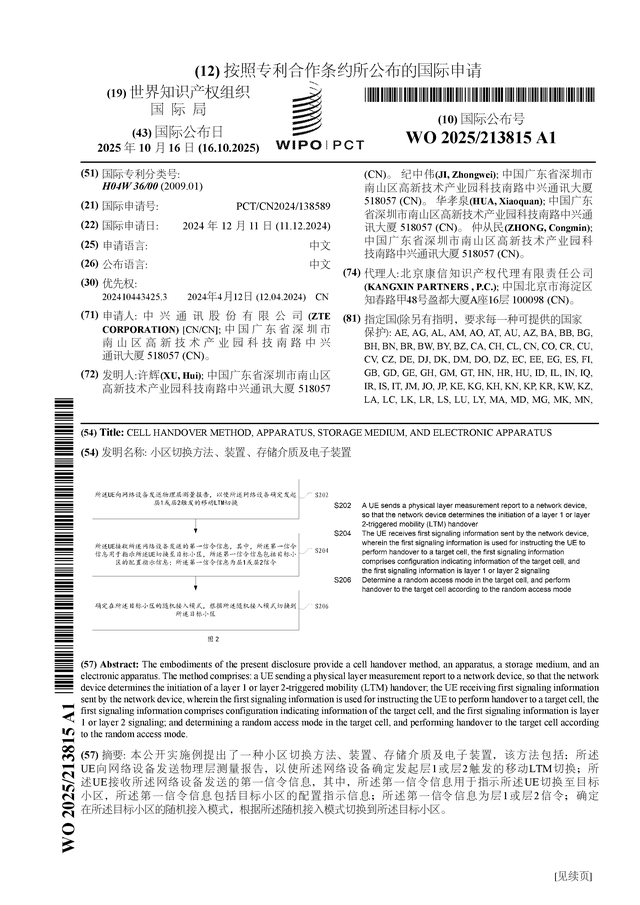证券之星消息,根据企查查数据显示中兴通讯(000063)公布了一项国际专利申请,专利名为“小区切换方法、装置、存储介质及电子装置”,专利申请号为PCT/CN2024/138589,国际公布日为2025年10月16日。