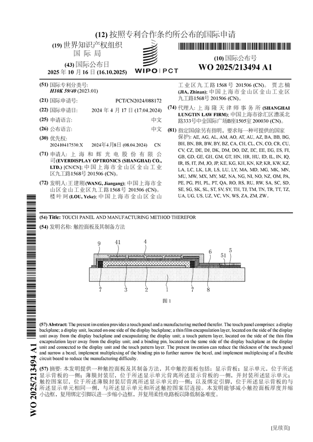 证券之星消息,根据企查查数据显示和辉光电(688538)公布了一项国际专利申请,专利名为“触控面板及其制备方法”,专利申请号为PCT/CN2024/088172,国际公布日为2025年10月16日。