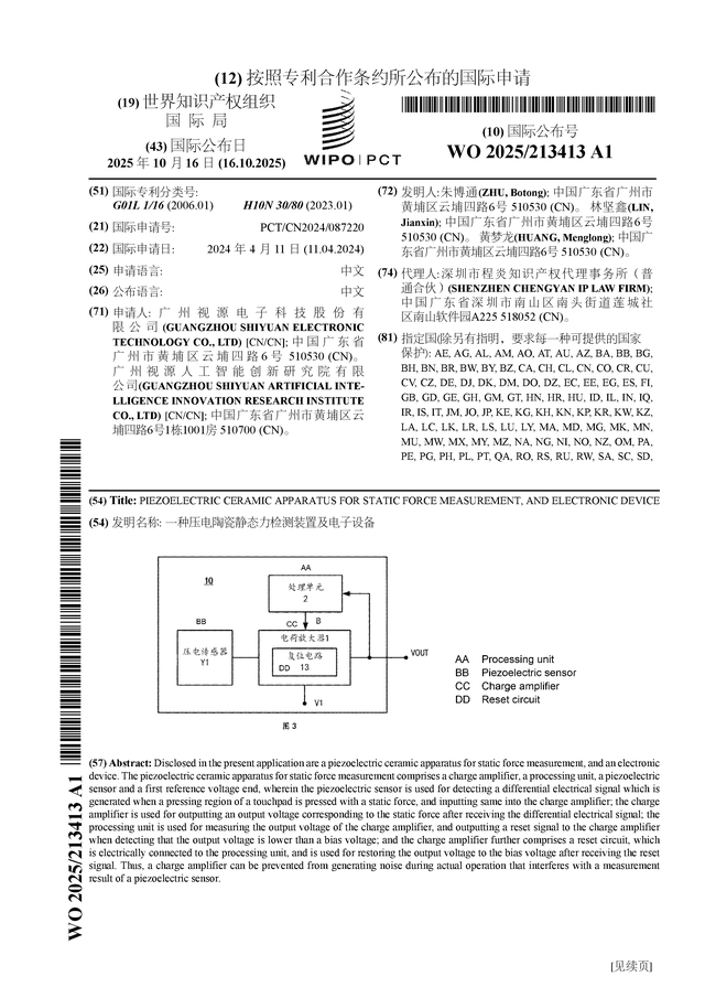 证券之星消息,根据企查查数据显示视源股份(002841)公布了一项国际专利申请,专利名为“一种压电陶瓷静态力检测装置及电子设备”,专利申请号为PCT/CN2024/087220,国际公布日为2025年10月16日。