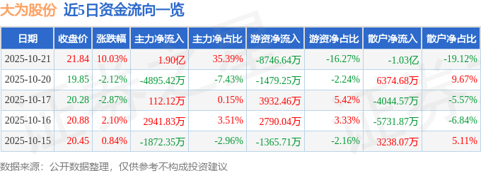 证券之星消息,大为股份10月21日涨停收盘,收盘价21.84元。该股于9点48分涨停,未打开涨停,截止收盘封单资金为1.21亿元,占其流通市值2.68%。