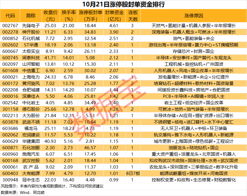 以封单金额计算,24股封单资金均超1亿元,先锋电子、神开股份、石化机械封单资金居前,分别为4.61亿元、3.9亿元、2.51亿元。