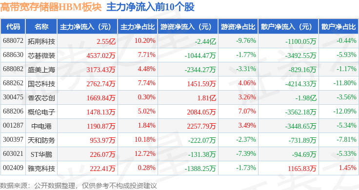 从资金流向上来看,当日高带宽存储器HBM板块主力资金净流出6.08亿元,游资资金净流出5486.46万元,散户资金净流入6.63亿元。高带宽存储器HBM板块个股资金流向见下表: