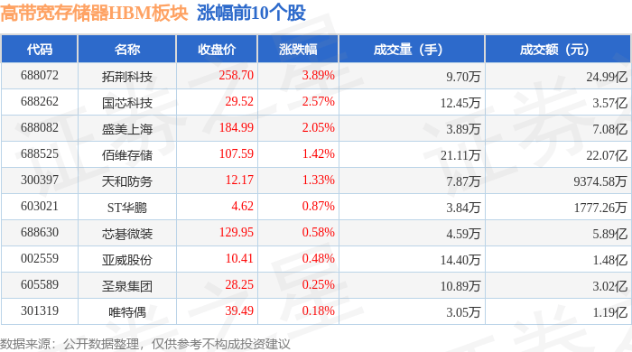 证券之星消息,10月23日高带宽存储器HBM板块较上一交易日下跌0.12%,华海诚科领跌。当日上证指数报收于3922.41,上涨0.22%。深证成指报收于13025.45,上涨0.22%。高带宽存储器HBM板块个股涨跌见下表: