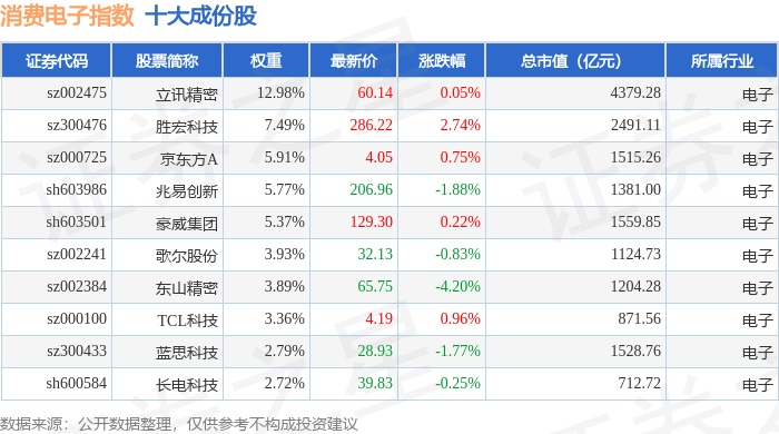 消费电子(980030)指数十大成份股详情如下: