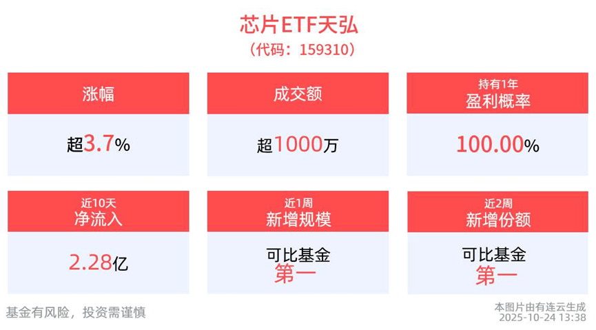 截至10月23日,芯片ETF天弘(159310)近1周规模增长3848.98万元,近2周份额增长7100.00万份,实现显著增长,新增规模、份额均位居可比基金第一。
