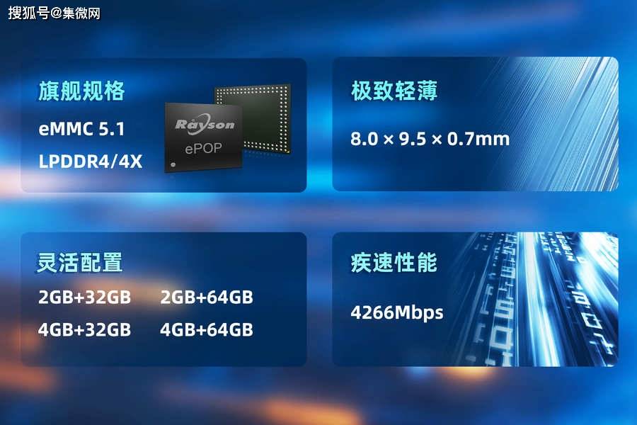 ePOP 存储芯片采用先进的 POP(Package on Package,层叠式封装)技术,整体尺寸仅 8.0 mm × 9.5 mm,厚度最薄可达 0.7 mm,相比传统分立式存储方案大幅缩小。这样“指甲盖般”的微小体积,不仅精准契合智能穿戴设备对内部空间的极致要求,也为终端厂商在外观设计与结构堆叠上释放更多可能。