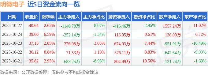 证券之星消息,截至2025年10月27日收盘,明微电子(688699)报收于40.64元,上涨2.63%,换手率3.17%,成交量3.49万手,成交额1.41亿元。