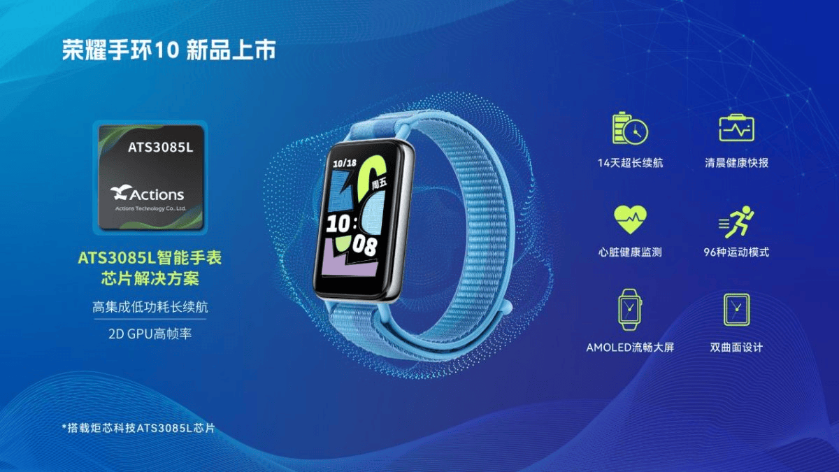 荣耀手环10:搭载了炬芯科技的ATS3085L双模蓝牙智能手表SoC芯片,实现了流畅的交互体验和长时间的续航。
