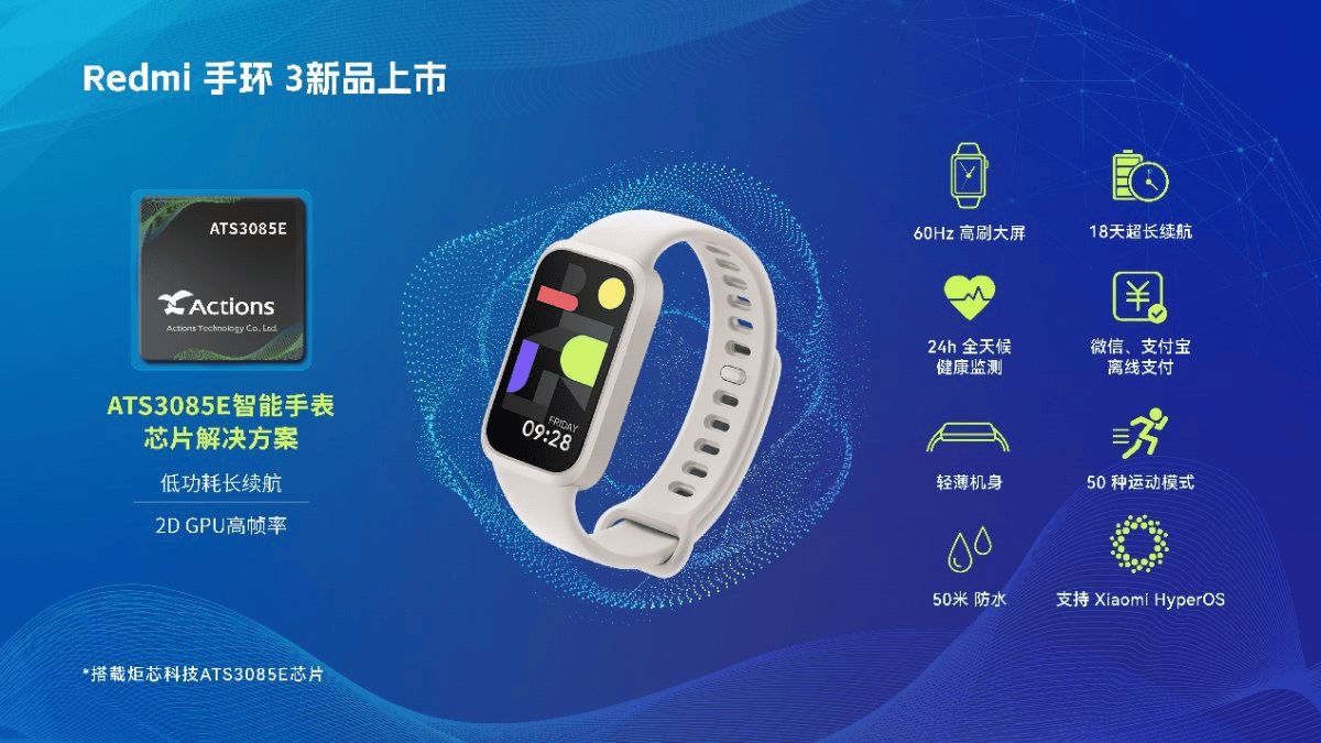 Redmi手环3:采用了炬芯科技的ATS3085E智能手表SoC芯片,搭配1.47英寸的60Hz高刷新率屏幕,全新升级300mAh的大容量电池,续航时间长达18 天。