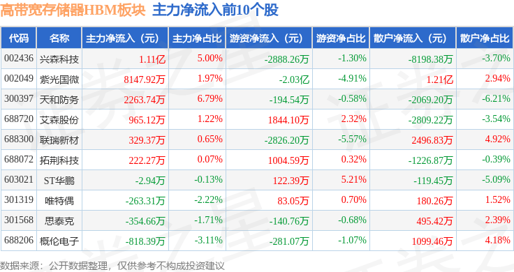 从资金流向上来看,当日高带宽存储器HBM板块主力资金净流出19.83亿元,游资资金净流出2.72亿元,散户资金净流入22.55亿元。高带宽存储器HBM板块个股资金流向见下表: