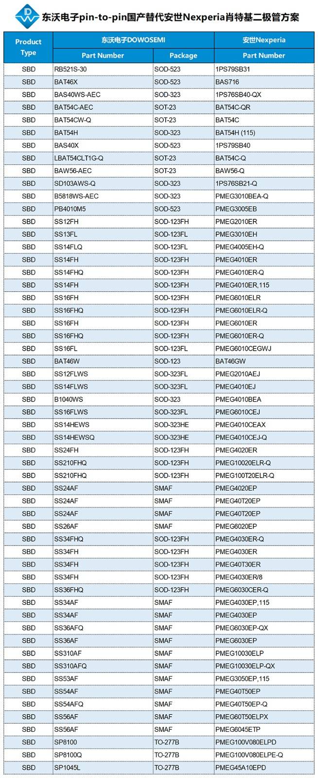 继此前发布“东沃电子pin-to-pin国产替代安世ESD二极管方案”后,现进一步推出“东沃电子pin-to-pin国产替代安世肖特基二极管方案”。为便于客户选型参考,以下列举部分常用热销替代型号(具体性能参数以规格书为准):