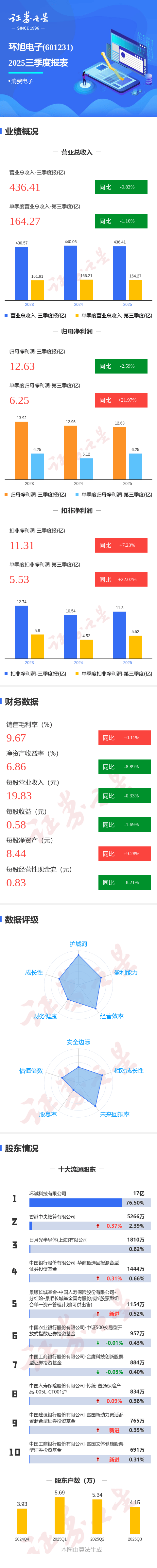 证券之星消息,环旭电子2025年三季报显示,公司主营收入436.41亿元,同比下降0.83%;归母净利润12.63亿元,同比下降2.6%;扣非净利润11.31亿元,同比上升7.23%;其中2025年第三季度,公司单季度主营收入164.27亿元,同比下降1.16%;单季度归母净利润6.25亿元,同比上升21.98%;单季度扣非净利润5.53亿元,同比上升22.08%;负债率55.09%,投资收益2.78亿元,财务费用2.44亿元,毛利率9.67%。