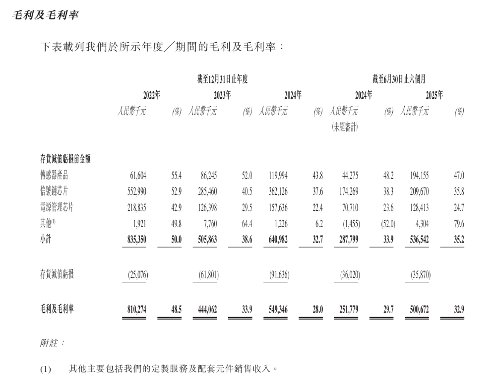 2025年上半年,纳芯微的毛利率为32.9%,由2024年上半年的29.7%增加3.2个百分点,主要是由于下游市场需求增加,同时纳芯微对产品组合进行了策略性优化,从而降低了毛利率较低产品的销售贡献,及纳芯微实施成本降低措施,降低了整体生产成本,包括材料成本、封装及测试成本。
