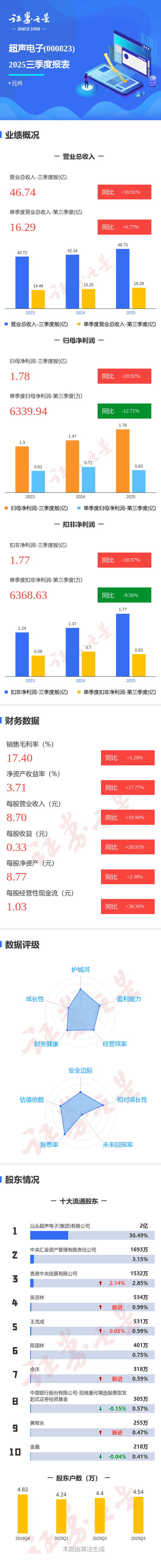 证券之星消息,超声电子2025年三季报显示,公司主营收入46.74亿元,同比上升10.91%;归母净利润1.78亿元,同比上升20.93%;扣非净利润1.77亿元,同比上升28.97%;其中2025年第三季度,公司单季度主营收入16.29亿元,同比上升6.77%;单季度归母净利润6339.94万元,同比下降12.71%;单季度扣非净利润6368.63万元,同比下降9.57%;负债率36.19%,投资收益1303.99万元,财务费用2560.99万元,毛利率17.4%。